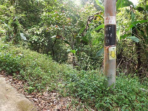This is one of a series of pages on walking the hills of Penang, click here for the index. This is a Grade 2 walk. There is a sketch map at the bottom showing the route followed. Please visit my Penang buses page for information on accessing the starting point. This account is linked from my Penang Peaks page which lists peaks over 400 metres as well as other places of interest and viewpoints. To find other hikes which visit this peak please check the maps of this are using this link. We've been in Penang for 8 weeks and looking at my maps, we've covered just about every area in the Balik Pulau bowl between Pantai Acheh and Pulau Betong, this seems to be the last, hence the strange extra zig-zag section later on. With effect from 2022, part of the initial climb described here has been blocked by the landowner and much of the next section affected by a new concrete road. For most people the best route now will be to continue further up the valley originally and take the new concrete road which rejoins the traditional trail part way up. A description of this is given on another page - the link will open in a new tab.. Having discovered I could pay our water bill in Balik Pulau, it was time to try the same with our annual 'assessment', broadly equivalent to the UK 'council tax' but a lot cheaper. That turned out to be just as easy with just one person ahead of me in the queue. No more visits to the ghastly Komtar! The idea was to meander up the north-east end of the Balik Pulau valley, trying to avoid both our regular trails and also the new zig-zag road. Along the way. we had plenty of time to spare and Yuehong (and I a bit) had conversations with three of the durian farmers in the hills, all Hakkas and each with rather different circumstances although all were obviously enjoying a situation where their orchards are now literally a gold mine although you wouldn't guess it from looking at them. No doubt each was happy to have an excuse to leave wife (and probably grandchildren) behind. We parked up at pole HT NH 4 74, between 'The Valley' and the main route up. We'd not tried the road opposite before. The first house on the left was abandoned and the next in use. We didn't need to visit it as there was a path on the right. This finished at the top of the rise and to the left through the 'grass' we found a set of 'Hakka Steps' probably the original way up the hill which we had also used further up to reach the first true house in the hills. We joined a concrete path and in no time were at the expected junction.