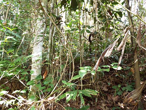 It's an old durian orchard and the trees are of some age, Management of the crop can't be easy, apart from keeping the underlying vegetation under control, I guess it's just a case of 'nanti durian' and collecting the fruits as they mature and fall. We soon got to the migrant workers' hut and noted that concrete paths now extended up the orchard - tempting but the ridge above would probably climb more quickly so they were unlikely to be of help, an assumption which turned out to be somewhat wrong.