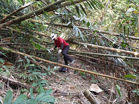 Next we came to another critical junction. The path to the right is a dead end - another flower garden. We needed to keep left and immediately that meant negotiating these fallen bamboo stems.