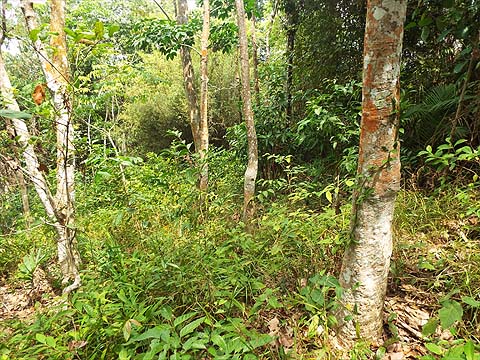 There were a couple of discarded drinking water bottles but, as we had expected, no sign of a regularly used path. The plan was to turn left and follow the ridge down to a col and then turn right to descend to a valley above the small Chinese settlement on the other side from our ascent. We hadn't known what to expect but there was some abandoned young rubber at the summit and then a succession of old rubber terraces. We used the remains of tapper's trails to drop down steadily, making sure we kept close to the ridge, not difficult as it was much steeper on either side.