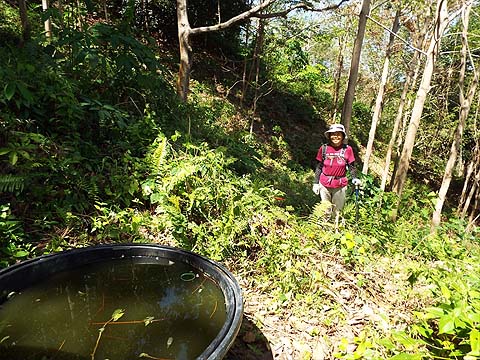 It was easy to follow where we had come up, the plants were still bent, and in just over 10 minutes I could see the plastic water tank at the top of the concrete path. I went down the ever lengthening zig-zags and beyond where we had joined I found a gap in the wire fence into the next orchard.