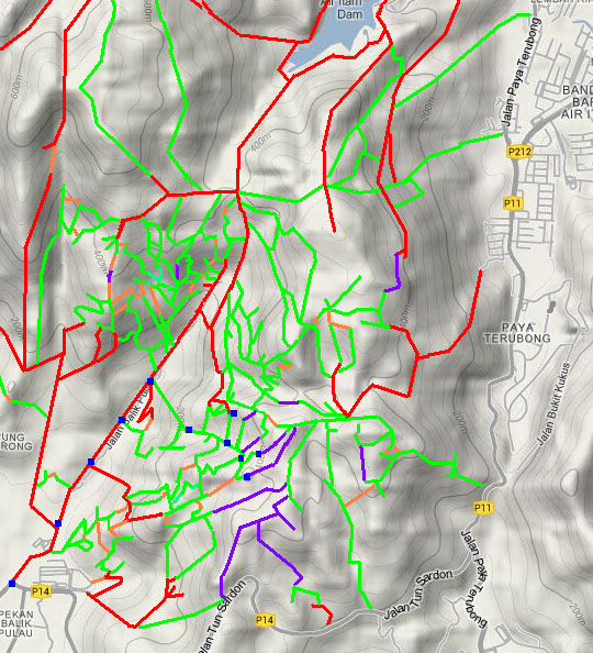 Turn right on to a second concrete path and follow it round the side of the hill being sure to keep right as shown. Keep going until you join a concrete road, turning right and following it beyond where it turns into a concrete path to the cross roads shown. Turn right here. (There is more information on the paths on this ridge in our Balik Pulau Explorer 1 report. If you want to continue reading our Balik Pulau Explorer Part 3 report, please note you should turn left up the hill and now click here.)