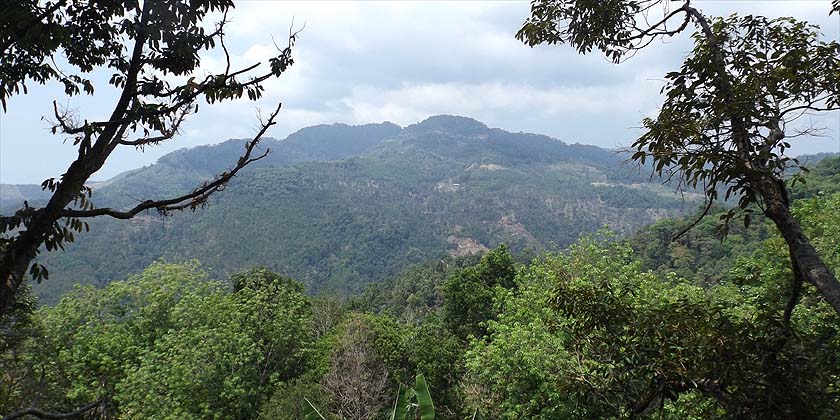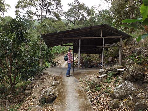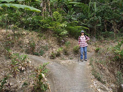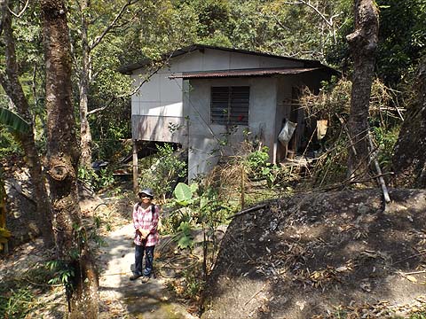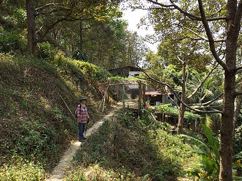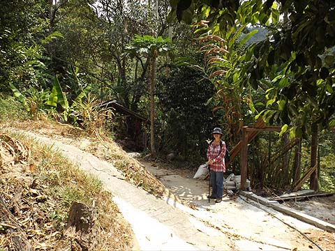 This is one of a series of pages on walking the hills of Penang, click here for the index. This is a Grade 2 walk. There is a sketch map at the bottom showing the route followed. Please visit my Penang buses page for information on accessing the starting point. We've actually had two walks in the area described below, the first was the actual 'explorer' but we have no pictures from it as we had a total camera failure, which considering the current temperature and humidity was not a complete surprise. We have since spent several days testing the paths on the east side above the Balik Pulau to Air Itam road, the others can be accessed by the index to this area. There are 4 side ridges running out from the main ridge between Anjung Indah and Bukit Penara, in future I shall refer to them by their numbers. Strictly there are 3 and the first one splits into two. Hence the Nibbinda Ridge is Ridge 1 and so on. Today's walk was in the area between Ridges 2 and 3. I confess we like this area because it is still almost completely durian and rubber and apart from rotational clearances it is 'green'. The house at the turn off (HT NH 4 88) on the Balik Pulau to Air Itam Road is in my book the classiest one in the valley. The owner knows what he is doing and has left many trees and planted many more young ones. Follow the road left and up, don't take the road with the barrier on the right - that's a joy to come. Go past the two houses climbing what is now a concrete path. The first junction is at a concrete platform, turn left here as the right path leads only to a small hut beyond which an old man told us there is no way out.