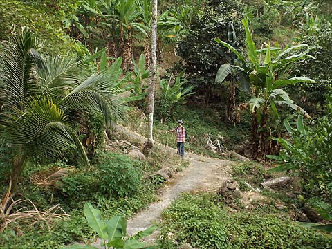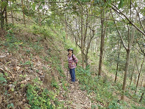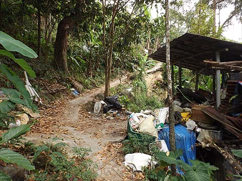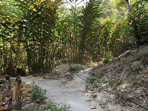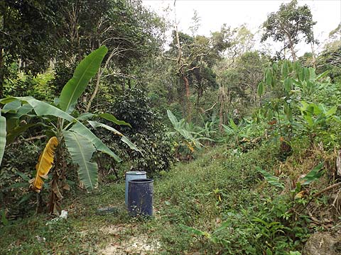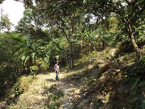 You will now be in a very well maintained durian estate, instead of taking the valley path straight up, turn sharp left up the path below (the picture is taken looking back down). .