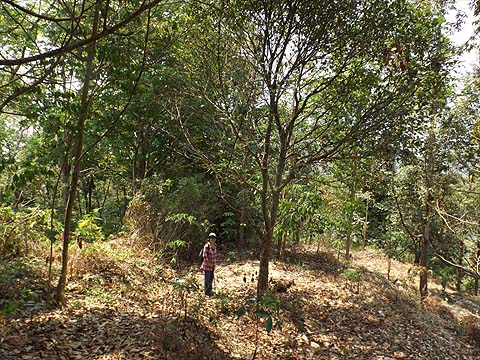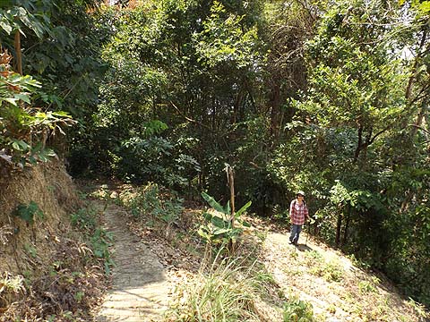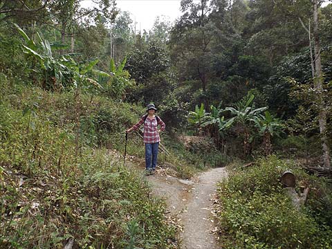 The path is now some way from the main valley path and soon we were back in the durians. I had previously had a quick look at the path back up to the right but found it a dead end. There was just one more house in the trees and then we were at the final main junction.