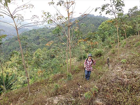 The path reaches a small hut over it and effectively ends. However, it leads on to an easily followed rubber terrace and very soon a path comes up from the right below and finishes. Follow this down.